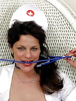- Horny housewife Genevieve Crest exposes meaty pussy lips.